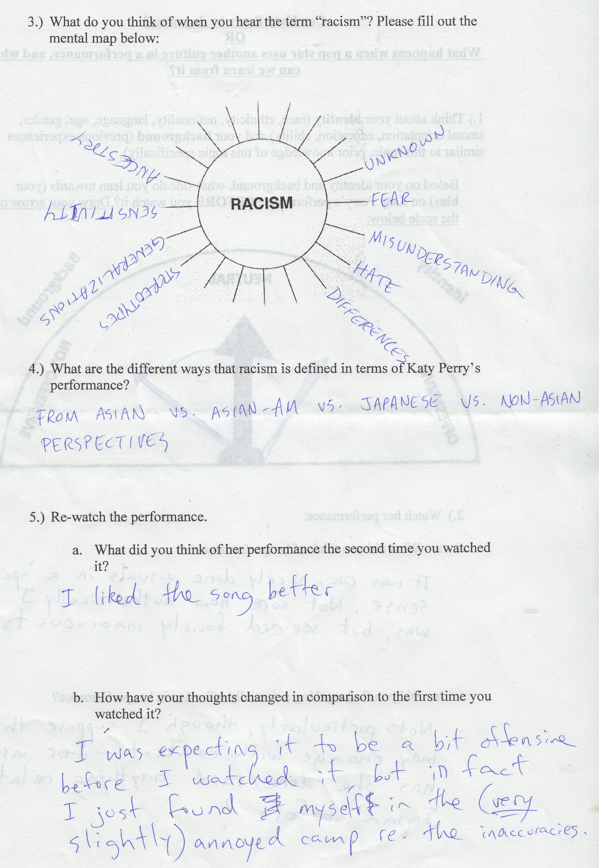 My lecture was entitled “Can Katy Perry be Japanese?” It was based on Katy Perry’s 2013 American Music Awards geisha-inspired performance, which subsequently led to an Internet storm of controversy. My presentation examined the similarities and differences in how Perry’s performance was received in the English-speaking world and in Japan, primarily via online news articles and blogs. It also aimed to be a guide for engaging in open-minded and informed discussions on sensitive topics such as race and cultural appropriation and/or cultural engagement. In addition to a PowerPoint, I also created a worksheet to help the audience collect their thoughts and stay engaged during my hour-long talk. (See a couple of the completed worksheets below.)